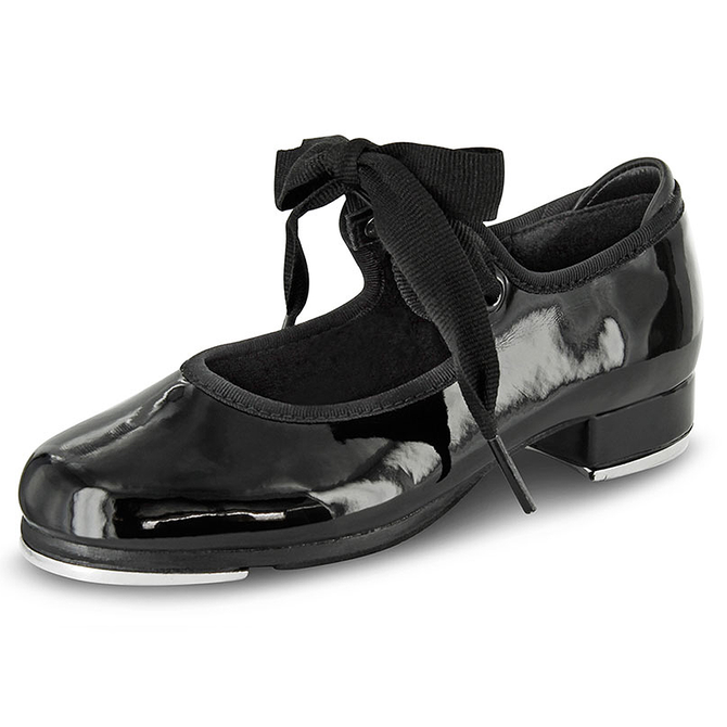 An introductory tap shoe with an elastic feature connecting the two side straps and securing the shoe to the foot. A ribbon can be threaded behind the elastic through two eyelets and tied to cover the elastic. For quick changes the shoe can be worn without ribbon.