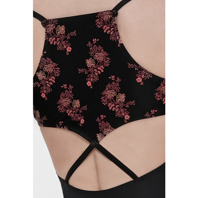 Microfiber leotard with thin straps and fancy printed microfiber. Classic front adorned with 3 small printed fabric buttons just below the neckline. Printed back yoke supported by thin symetrical straps. Full front lining.