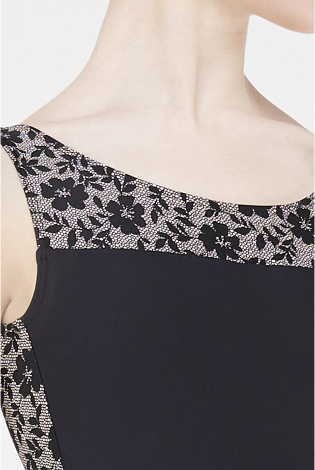 Tank strapped leotard with deep neckline and open back. The straps and upper part consist of fancy microfiber with a band of transparent stretch tulle around the entire waist. Full front lining.