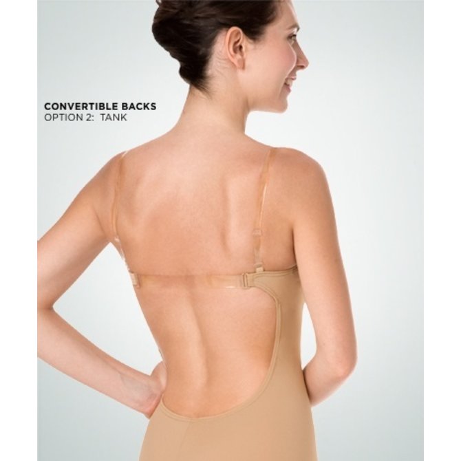 Padded convertible halter and or tank bra features see-through adjustable, elastic neck/shoulder straps, with two strap placement points and a strong, durable clear back band.