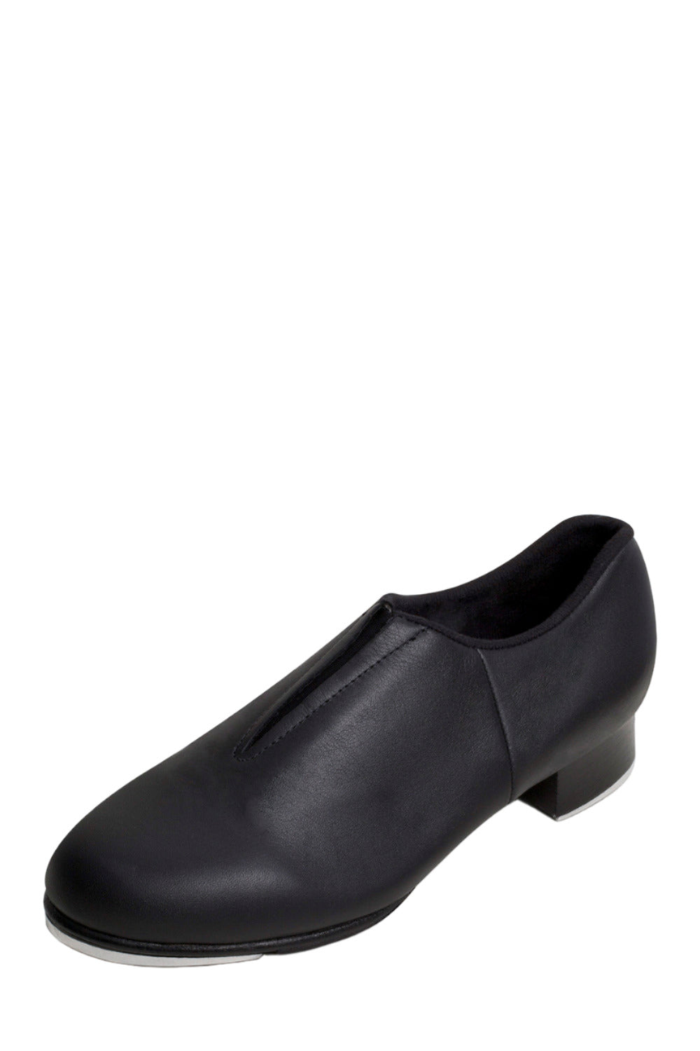 Slip on flexible tap shoe allows for freedom of movement with support. Slip on split sole tap shoe with leather upper and an elasticized instep piece.